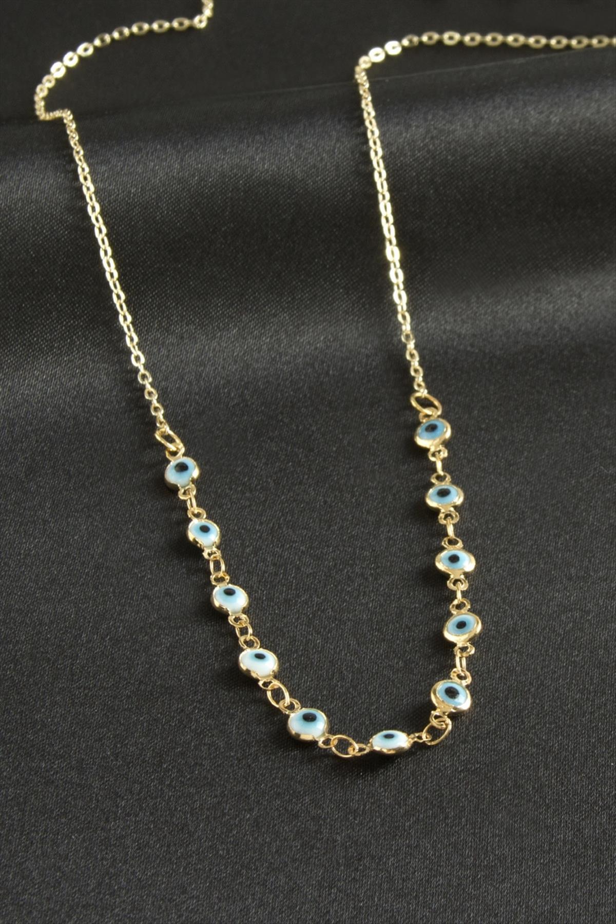 Kolye; Ürün malzemesi metal ve mine boyamadır. Ürün zincir uzunluğu 45 cmdir. Kartlıdır. Nazar boyu 0,5 mm dir.