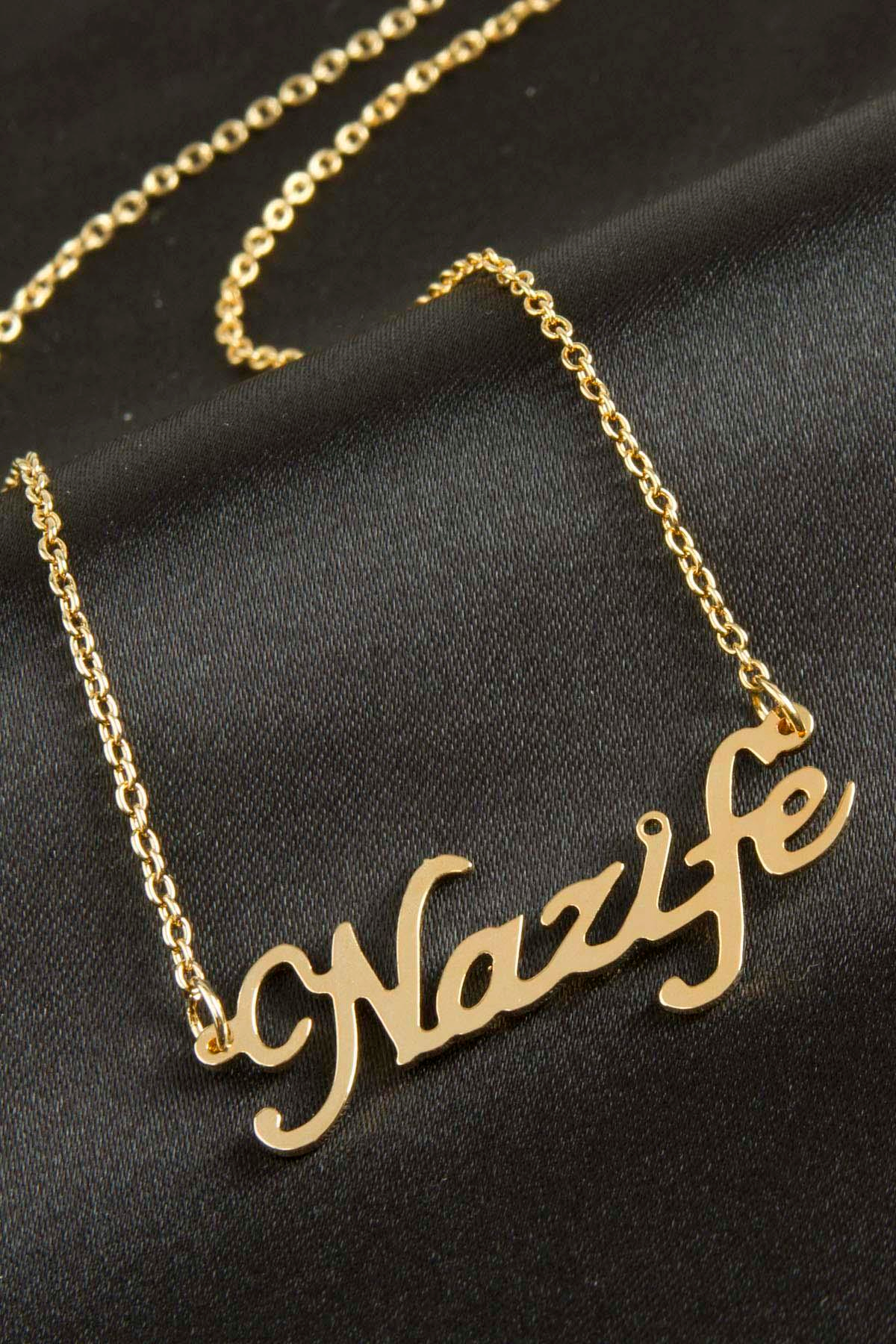 Nazife isimli kolye. İsimli kolye pirinç madeninden ve altın kaplamalıdır. Kişiye özel üretilmektedir.Yazdırmak istediğiniz ismi bize mesaj olarak iletmeniz gerekmektedir. Kullanıma bağlı olarak uzun süre kullanıma uygundur. Ürün malzemesi 1.sınıf kalitededir. Ürün ve zinciri sarı renktedir. Ürün zincir boyu 45 cm ve ürün üzerindeki isimler yaklaşık 3 cmdir. İsim boyları ürün ismine göre degişiklik göstermektedir.