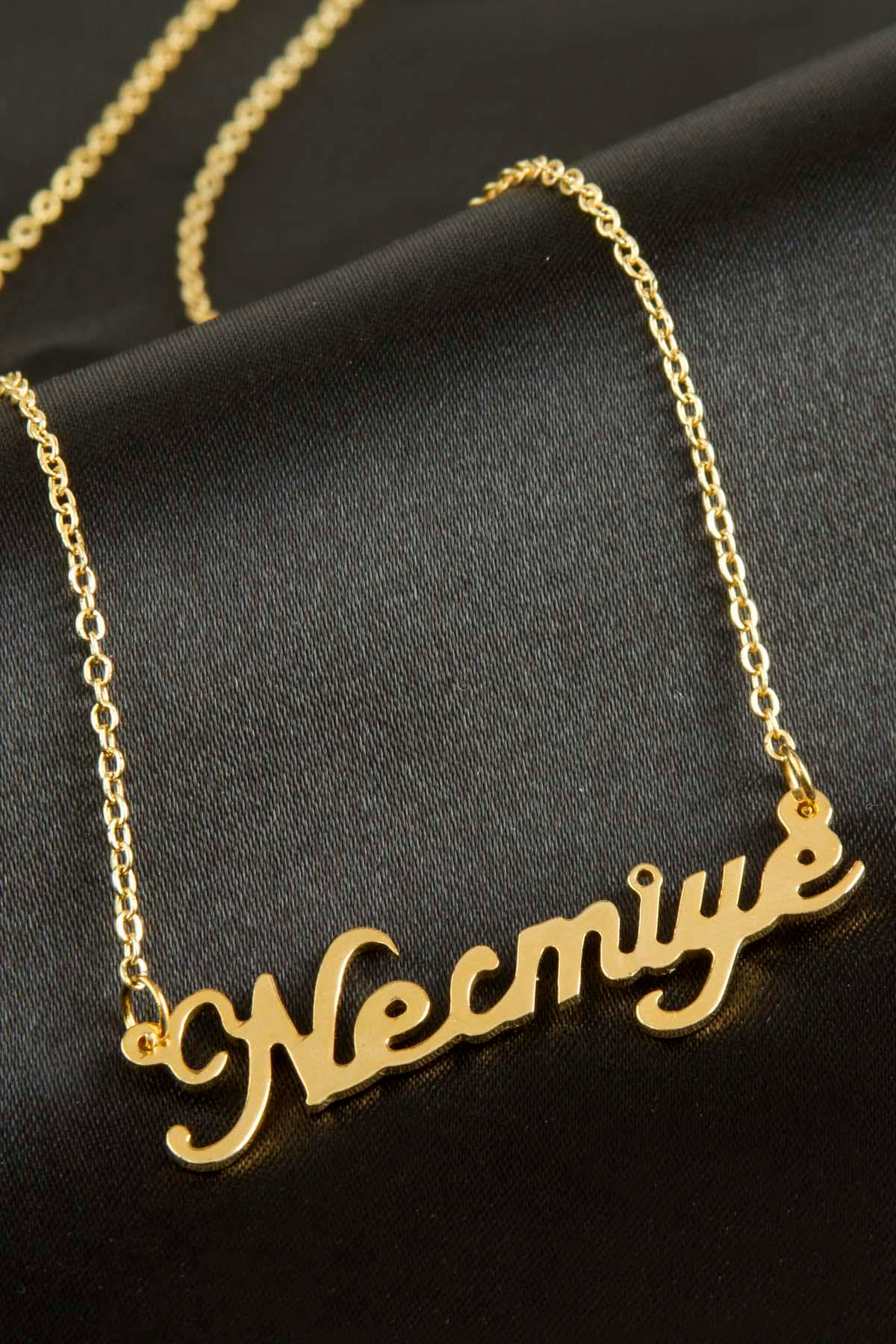 Necmiye isimli kolye. İsimli kolye pirinç madeninden ve altın kaplamalıdır. Kişiye özel üretilmektedir.Yazdırmak istediğiniz ismi bize mesaj olarak iletmeniz gerekmektedir. Kullanıma bağlı olarak uzun süre kullanıma uygundur. Ürün malzemesi 1.sınıf kalitededir. Ürün ve zinciri sarı renktedir. Ürün zincir boyu 45 cm ve ürün üzerindeki isimler yaklaşık 3 cmdir. İsim boyları ürün ismine göre degişiklik göstermektedir.