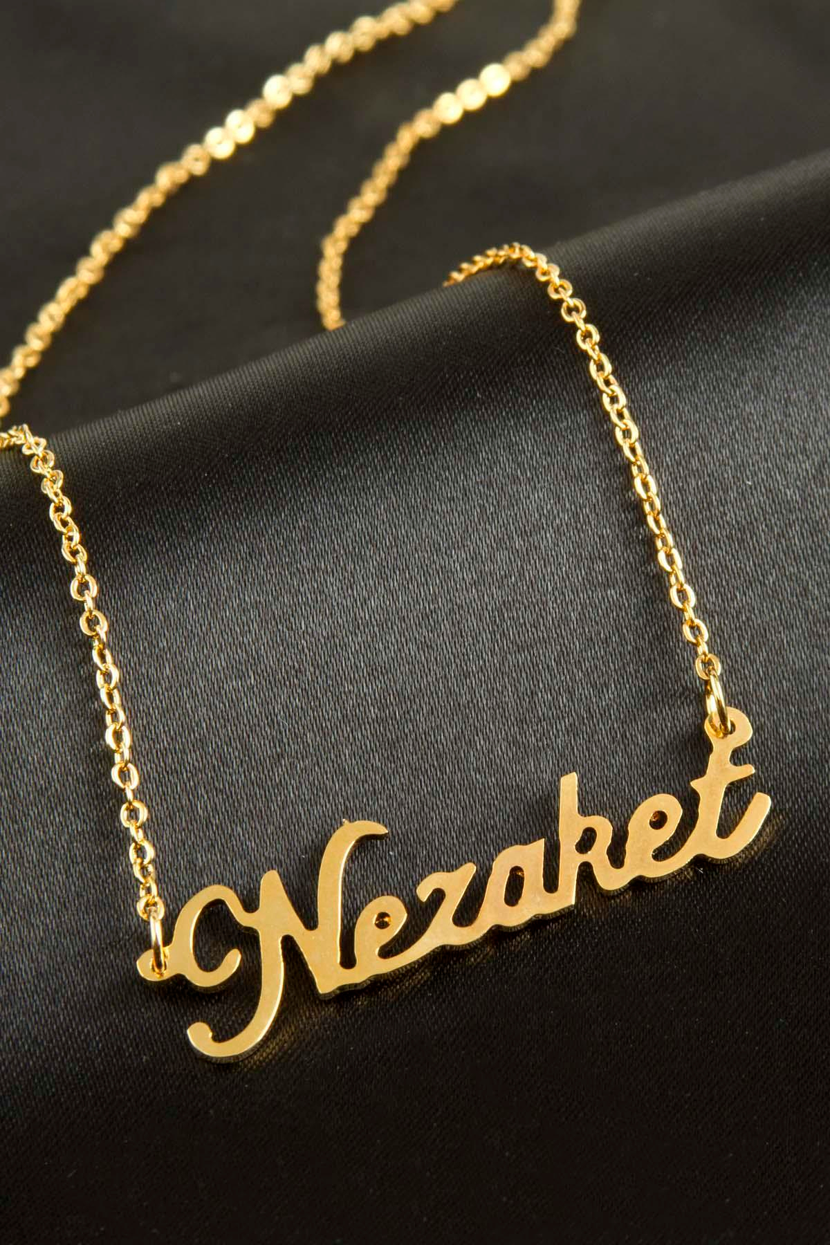 Nezaket isimli kolye. İsimli kolye pirinç madeninden ve altın kaplamalıdır. Kişiye özel üretilmektedir.Yazdırmak istediğiniz ismi bize mesaj olarak iletmeniz gerekmektedir. Kullanıma bağlı olarak uzun süre kullanıma uygundur. Ürün malzemesi 1.sınıf kalitededir. Ürün ve zinciri sarı renktedir. Ürün zincir boyu 45 cm ve ürün üzerindeki isimler yaklaşık 3 cmdir. İsim boyları ürün ismine göre degişiklik göstermektedir.