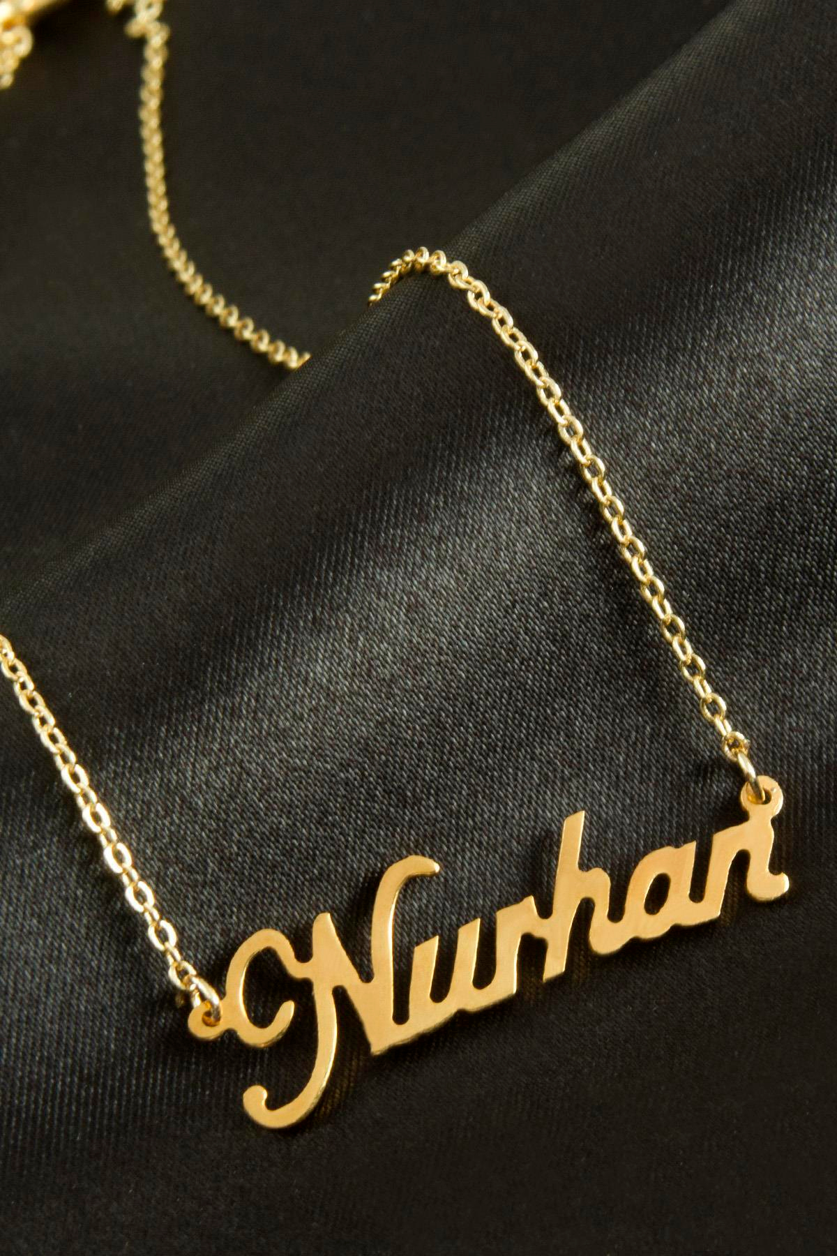 Nurhan İsimli Kolye. İsimli kolye pirinç madeninden ve altın kaplamalıdır. Kişiye özel üretilmektedir.Yazdırmak istediğiniz ismi bize mesaj olarak iletmeniz gerekmektedir. Kullanıma bağlı olarak uzun süre kullanıma uygundur. Ürün malzemesi 1.sınıf kalitededir. Ürün ve zinciri sarı renktedir. Ürün zincir boyu 45 cm ve ürün üzerindeki isimler yaklaşık 3 cmdir. İsim boyları ürün ismine göre degişiklik göstermektedir.