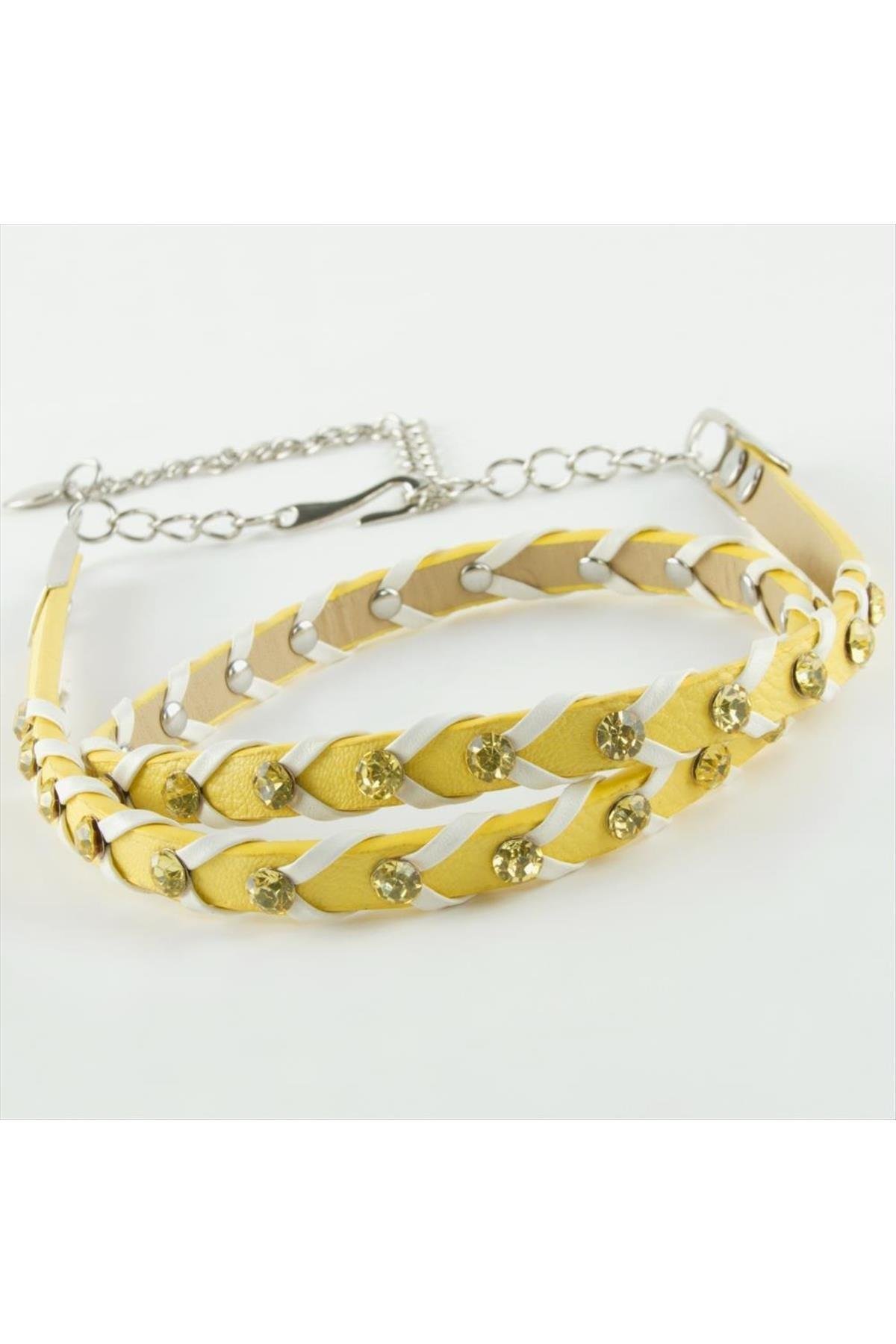 Örgü modelli kristal model taşlı ve ayarlanabilir zincirli deri kemer. ürün uzunluğu uzatma zinciri dahil 103 cm genişliği 1 cm dir