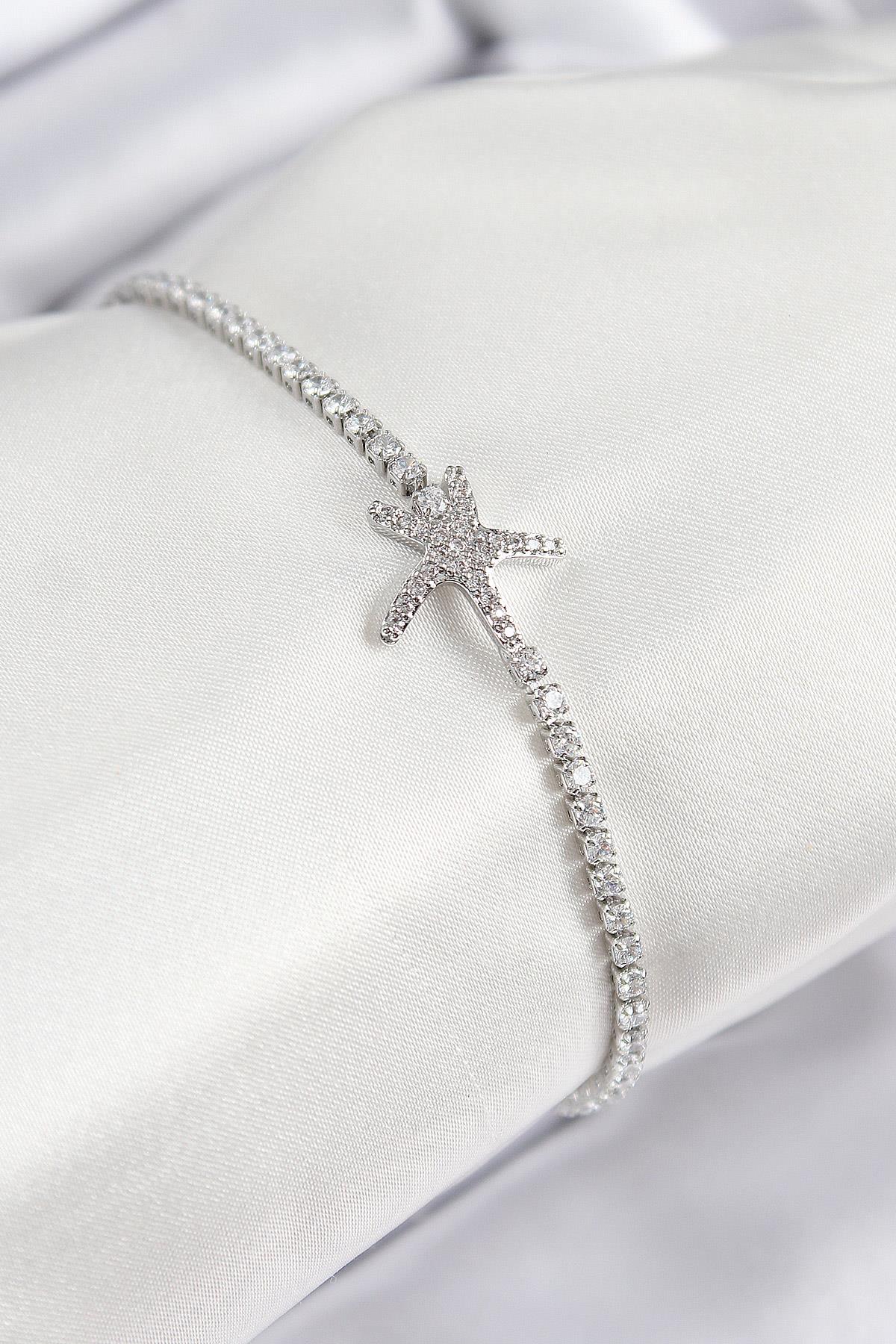 Pirinç Zirkon Taşlı Deniz Yıldızı Model Gümüş Renk Kadın Bileklik