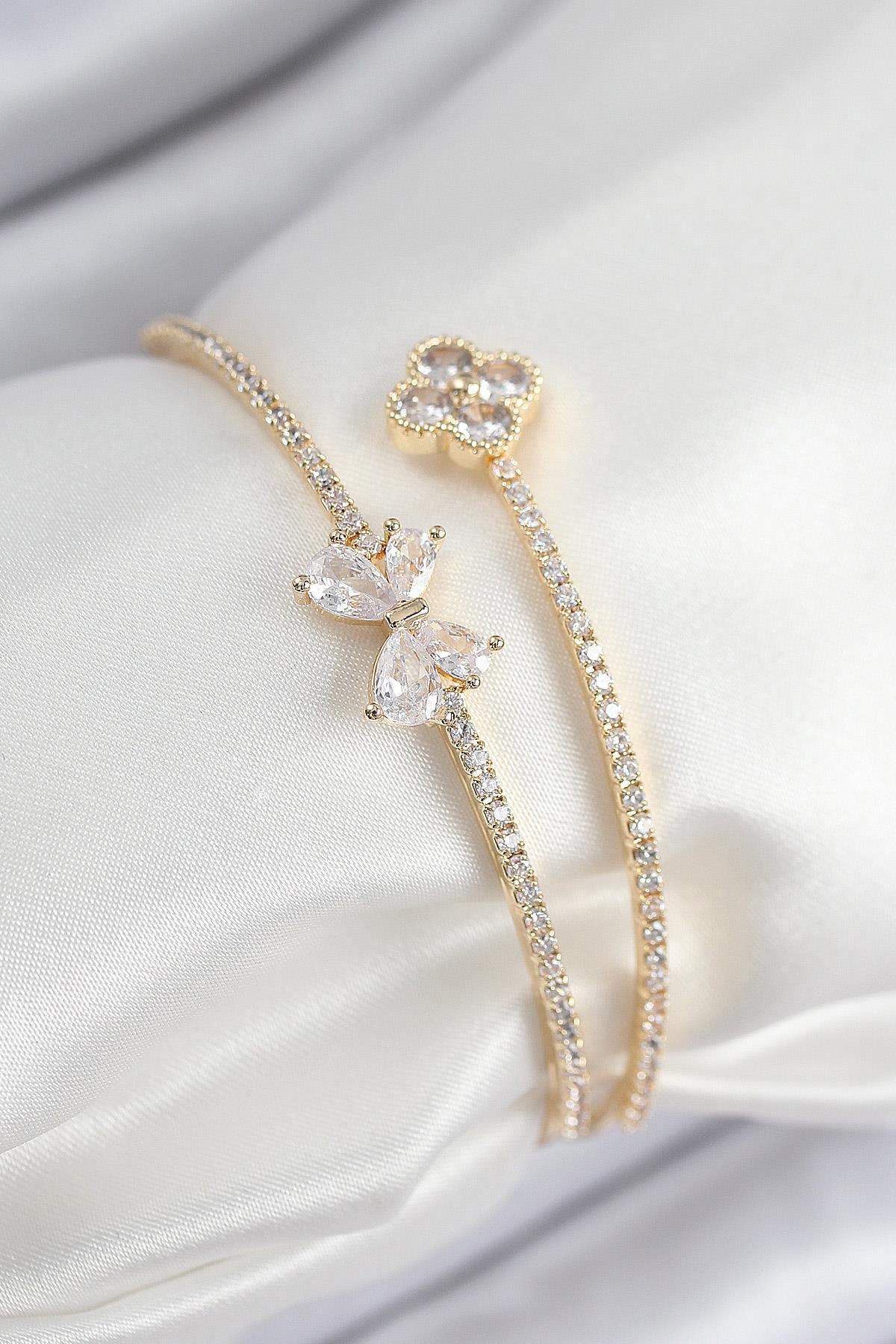Pirinç Zirkon Taşlı Fiyonk Ve Yonca Model Gold Renk Kadın Bileklik