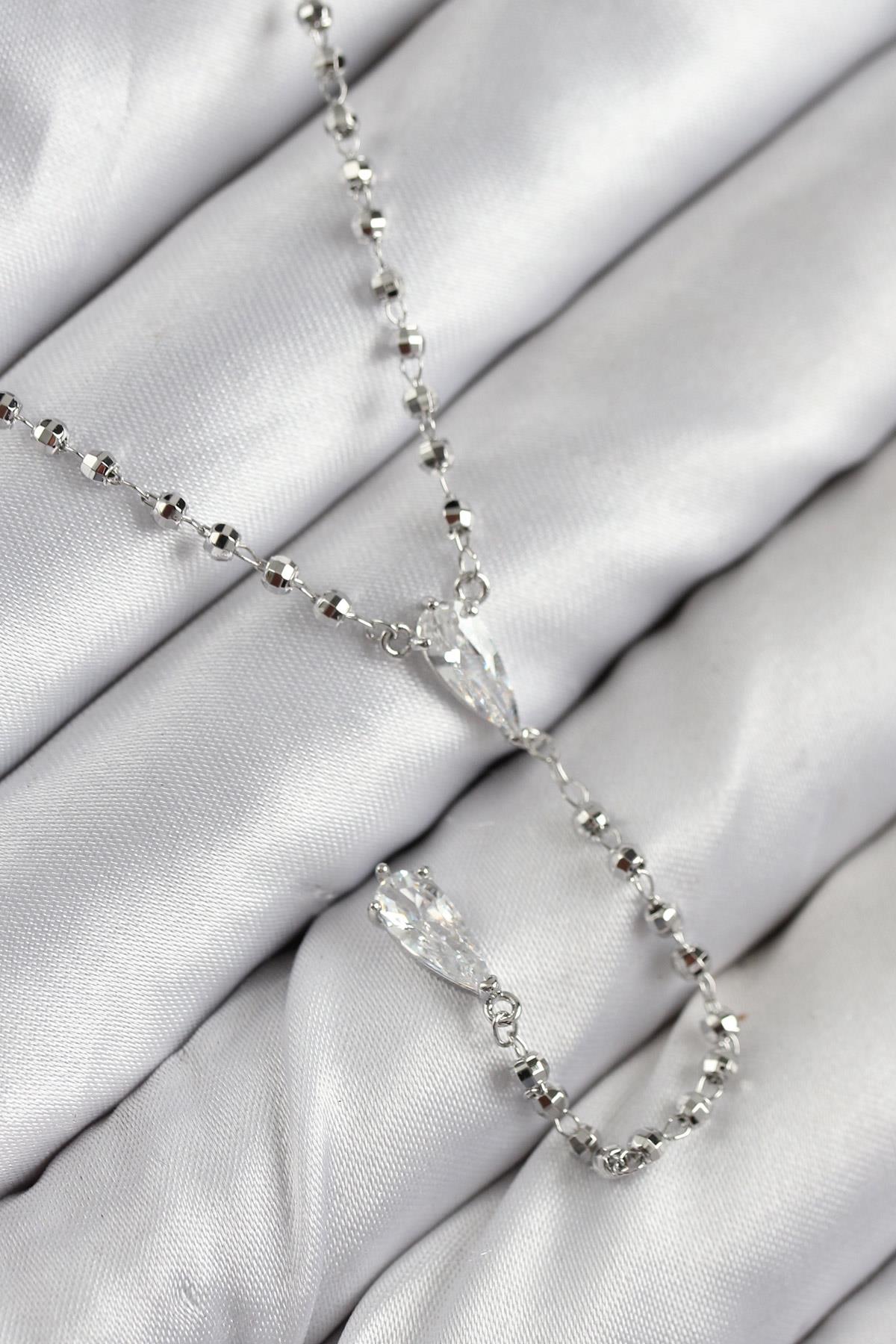 Pirinç Zirkon Taşlı Gümüş Renk Kadın Y Kolye
