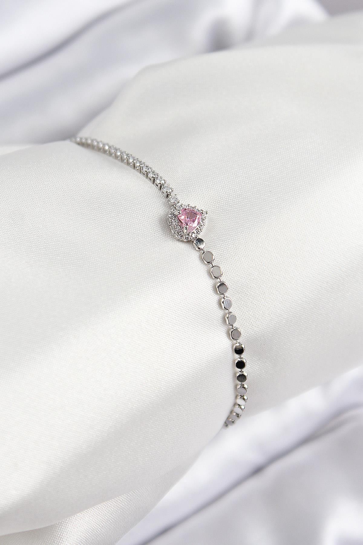 Pirinç Zirkon Taşlı Kalp Model Ezme Zincir Gümüş Renk Kadın Bileklik - PRT3500EB07997