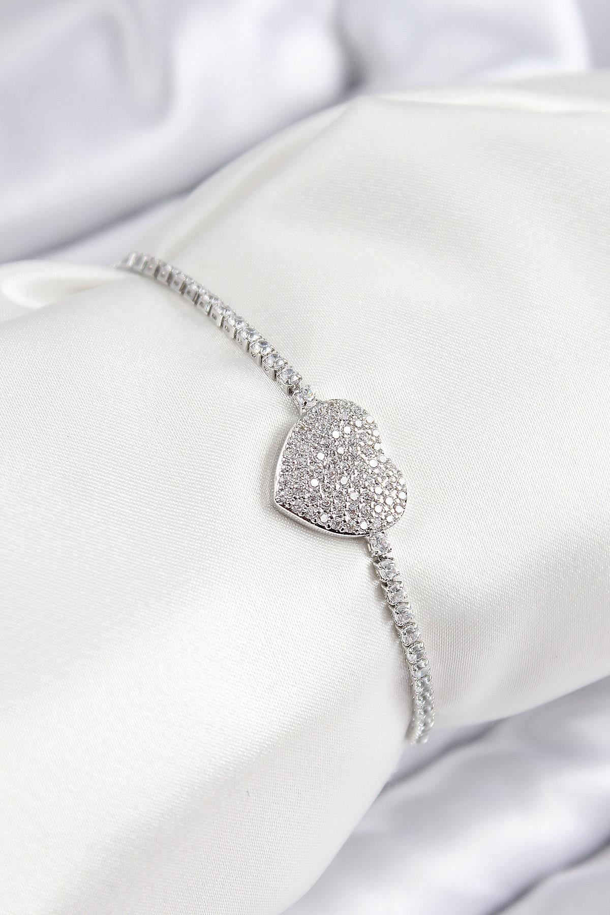 Pirinç Zirkon Taşlı Kalp Model Gümüş Renk Asansörlü Kadın Bileklik