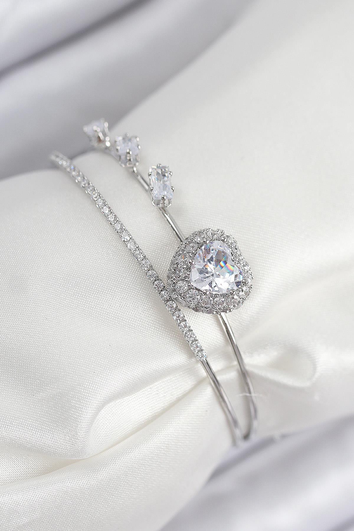 Pirinç Zirkon Taşlı Kalp Model Gümüş Renk Kadın Bileklik