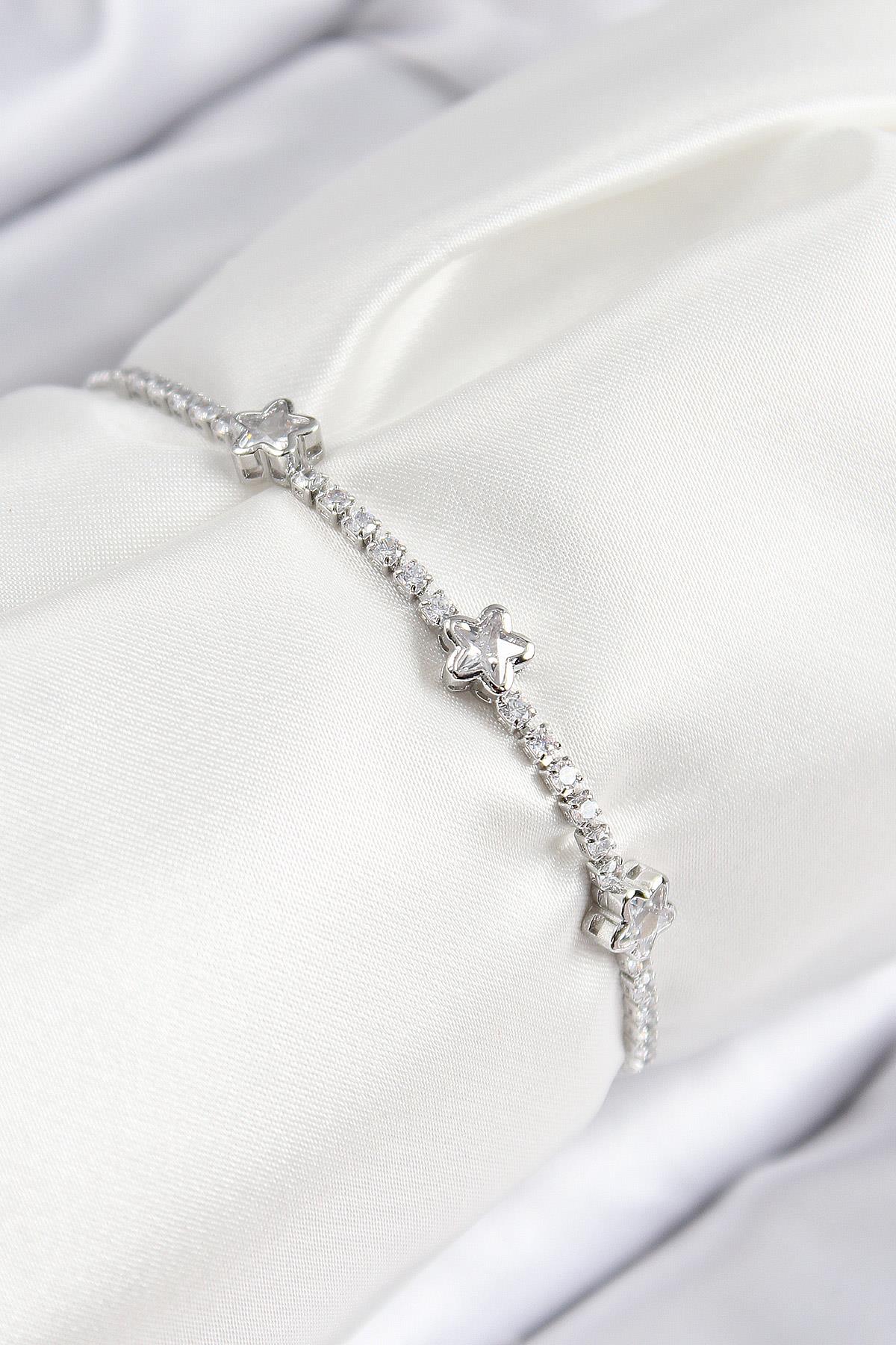Pirinç Zirkon Taşlı Yıldız Model Gümüş Renk Asansörlü Kadın Bileklik