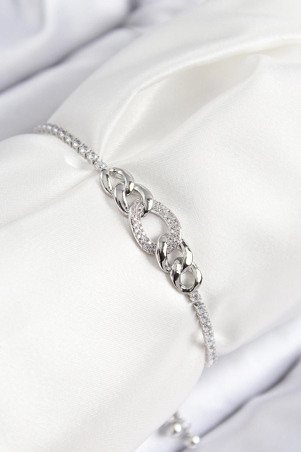 Pirinç Zirkon Taşlı Zincir Model Gümüş Renk Asansörlü Kadın Bileklik - PRT3500EB08474