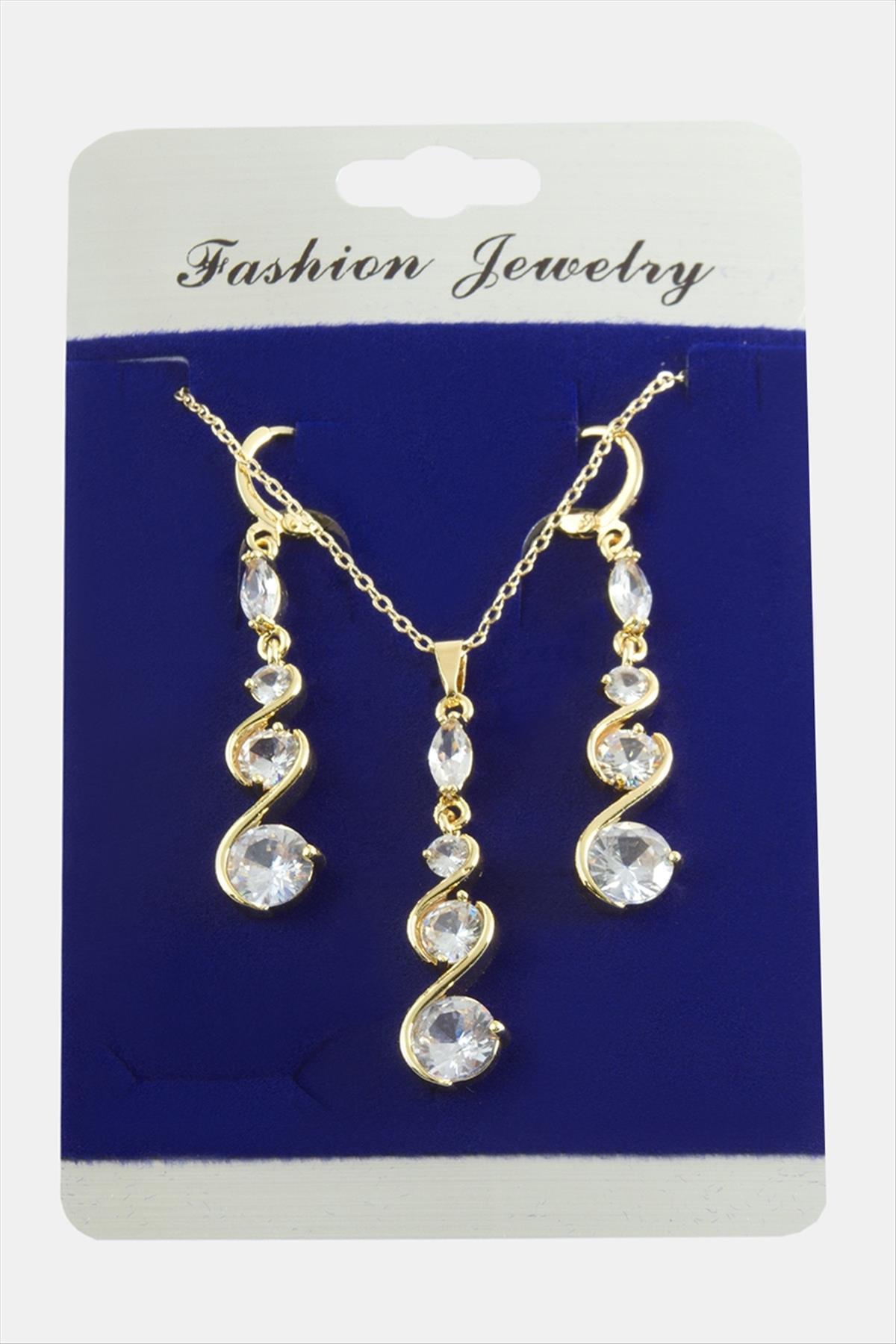Kolye; Ürün malzemesi metal ve zirkon taştan üretilmiştir. 1 sınıf kaliteli malzeme kullanılmıştır. Ürün 1 adet kolye, ve 1 adet çift küpe vardır. Ürün zincir uzunluğu 45 santimdir. Ürün ucundaki taşlı aparat boyu 3 cmdir.