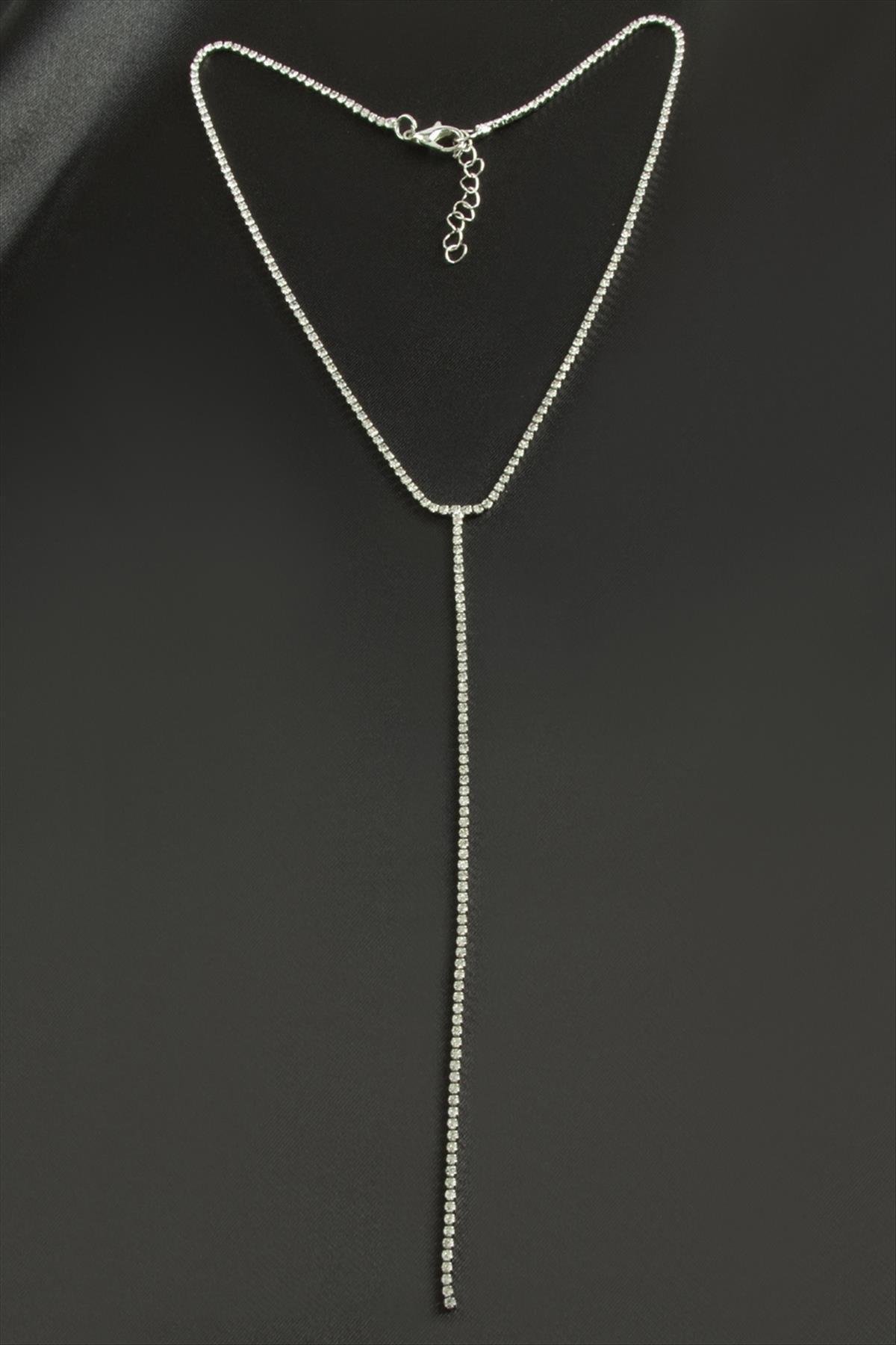 Kolye; Ürün malzemesi taş ve çeliktir. Ürün boyu 45 cmdir. Ucundaki sallantılı zincir bölümü uzunluğu 13 cmdir. Taş boyu 2 mmdir.