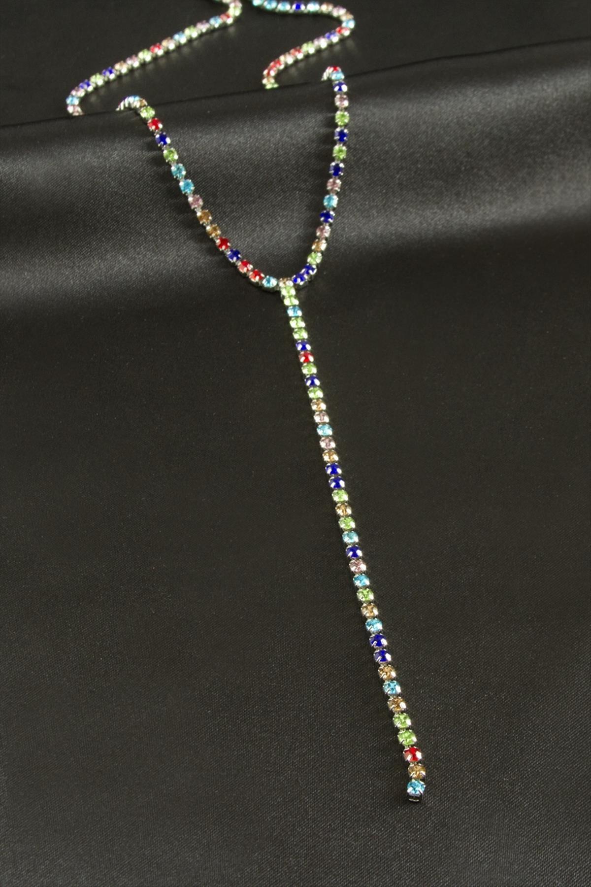 Kolye; Ürün malzemesi taş ve çeliktir. Ürün boyu 45 cmdir. Ucundaki sallantılı zincir bölümü uzunluğu 13 cmdir. Taş boyu 4 mmdir.