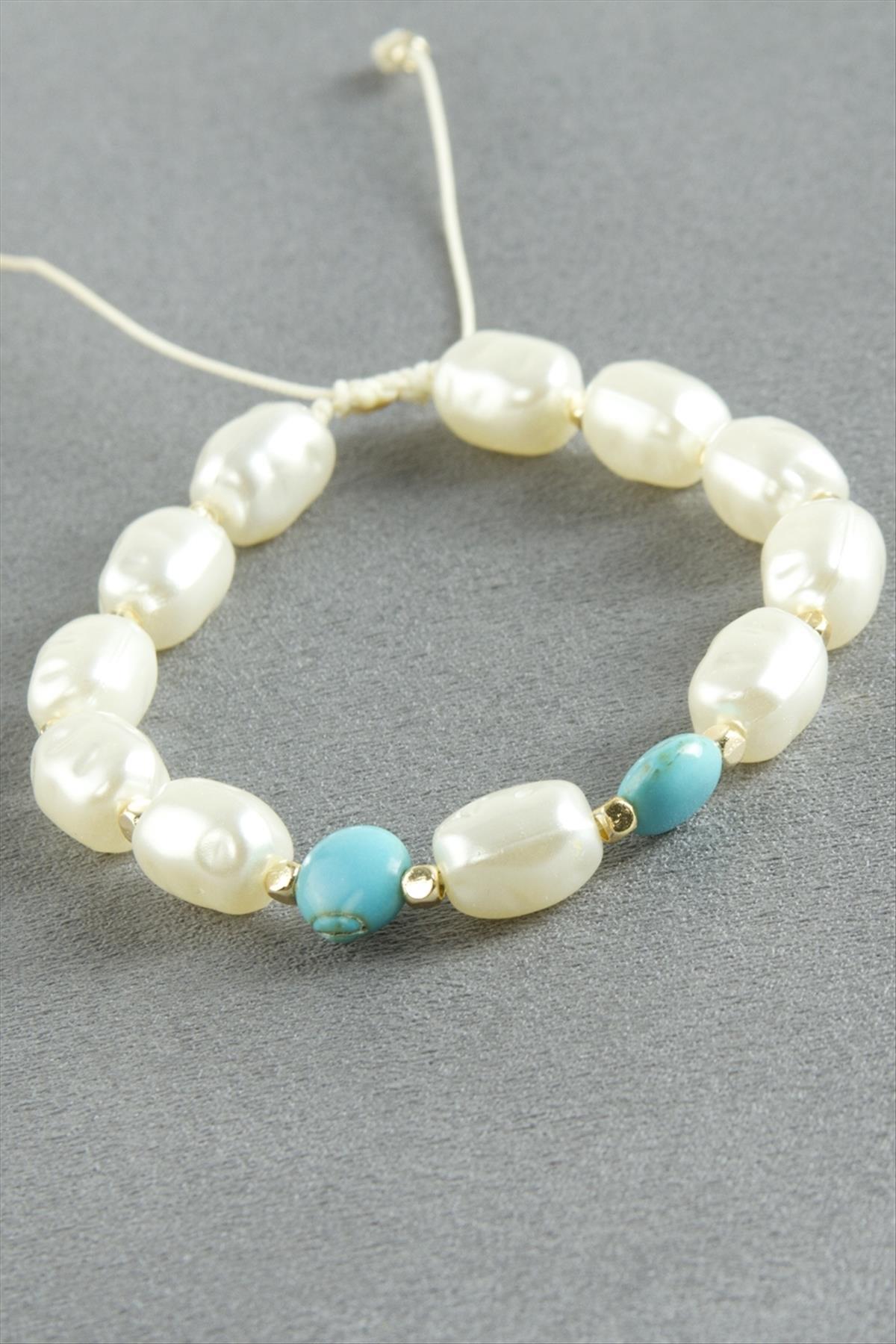 Bileklik; Ürün malzemesi turkuaz doğaltaş, inci ve makrome iptir. Ürün arkası asansörlüdür. Bileğe göre ayarlanabilir.