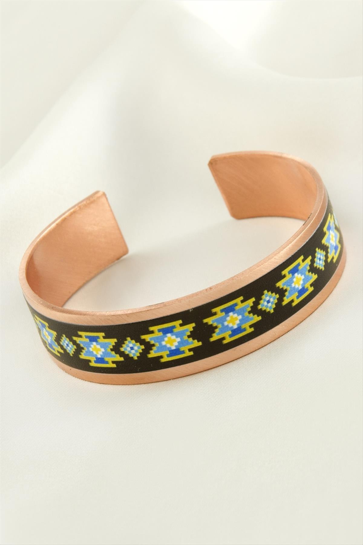 Bileklik; Ürün malzemesi bakır malzemeden üretilmiştir. Ürün yanlara doğru esneme özellği bulunmaktadır. Ürün kalınlığı 1,5 cm ve bakır bölümü uzunluğu 17 cmdir.