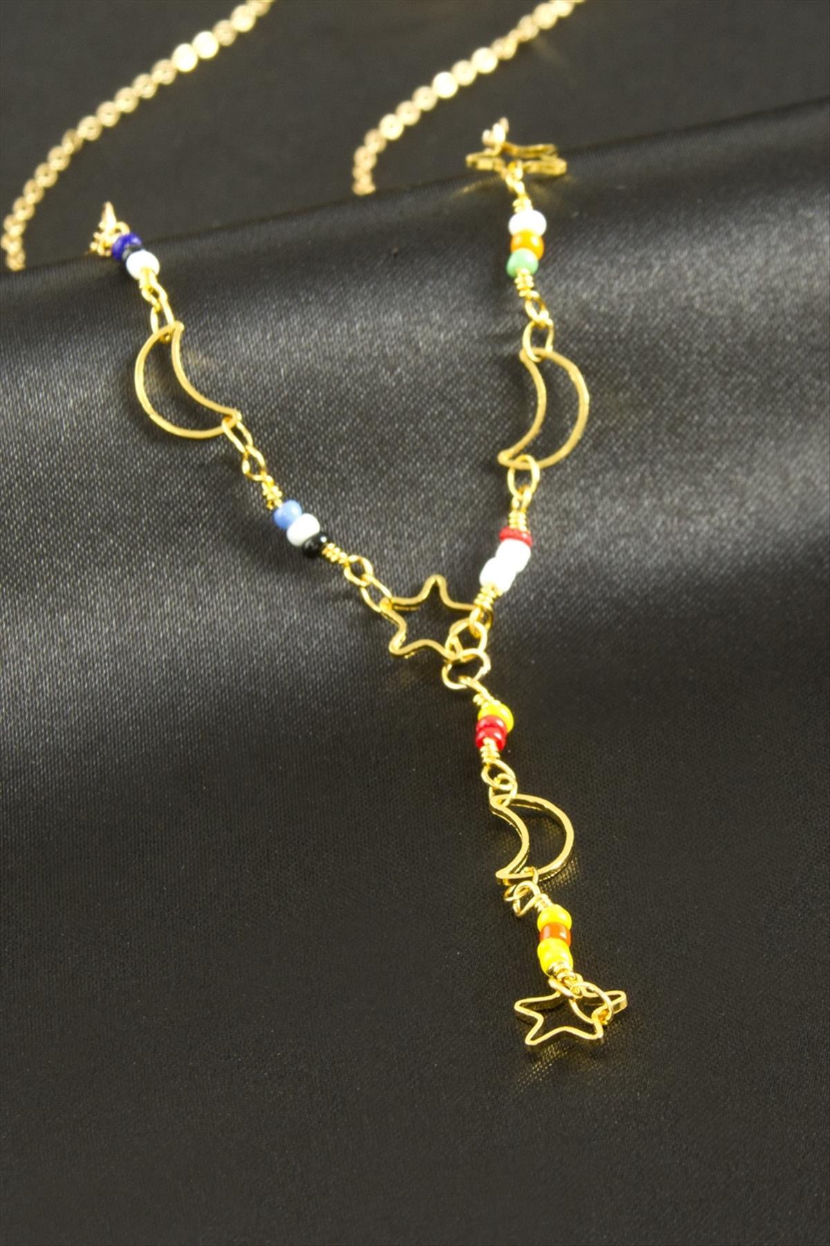 Kolye; Ürün malzemesi kum boncuk ve metaldir. 1 sınıf kaliteli malzemeden üretilmiştir. Ürün boyu 54 cmdir. Kartlıdır.