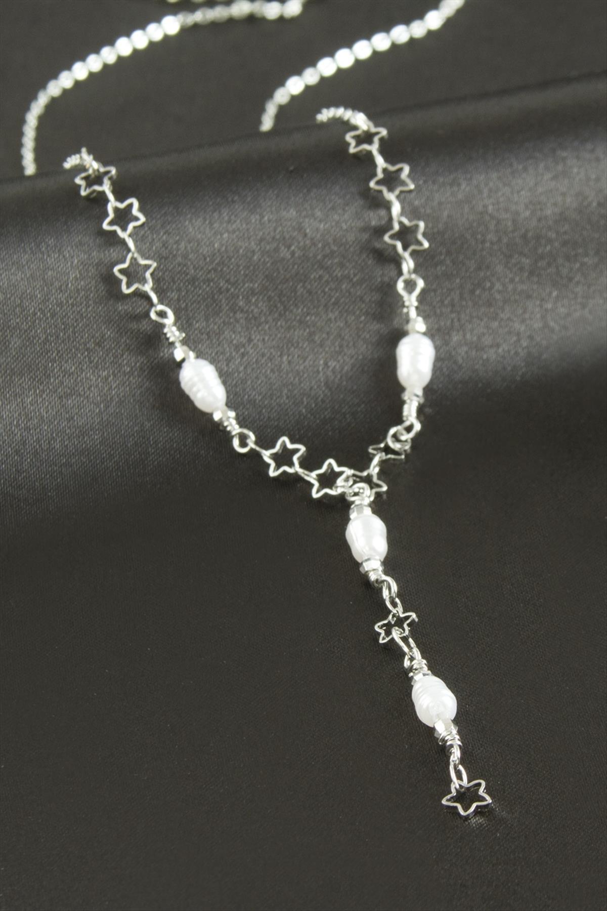 Kolye; Ürün malzemesi inci ve metaldir. 1 sınıf kaliteli malzemeden üretilmiştir. Ürün boyu 54 cmdir. Kartlıdır.