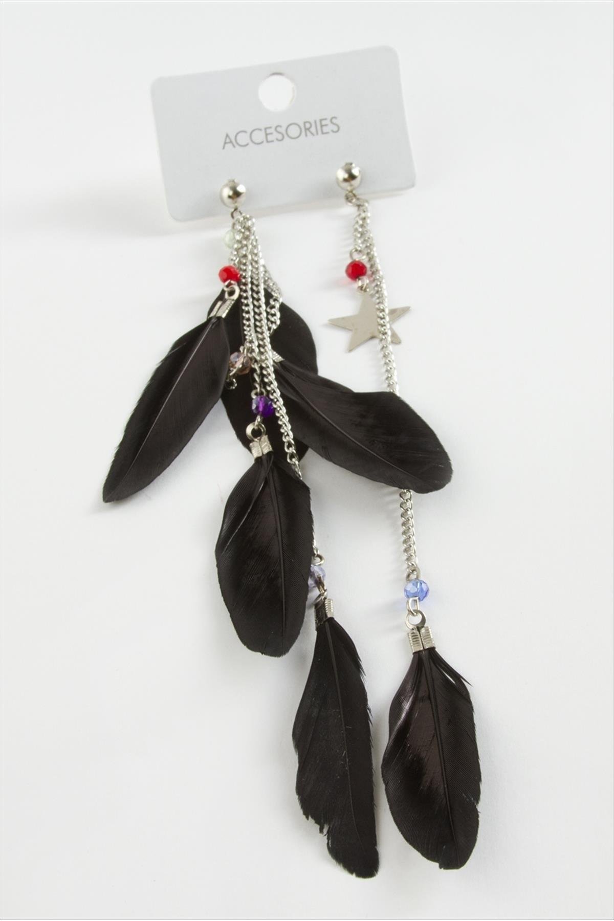 Küpe; Ürün malzemesi metal, kristal ve tüydür. Kartıyla beraber gönderilecektir. Ürün uzunluğu 16 cmdir. Ürün zincir üzerine muhlanmış kristal boncuk ve tüylerden üretilmiştir.