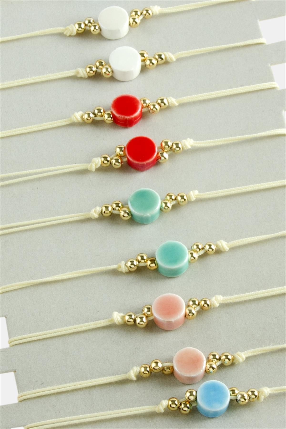Bileklik; Ürün malzemesi makrome ip ve camdır. Ürün asansörlü dür. Bileğe göre ayarlamalıdır. Ürün renkleri asortilidir. Siparişlerinizde karışık olarak göndeilecektir.