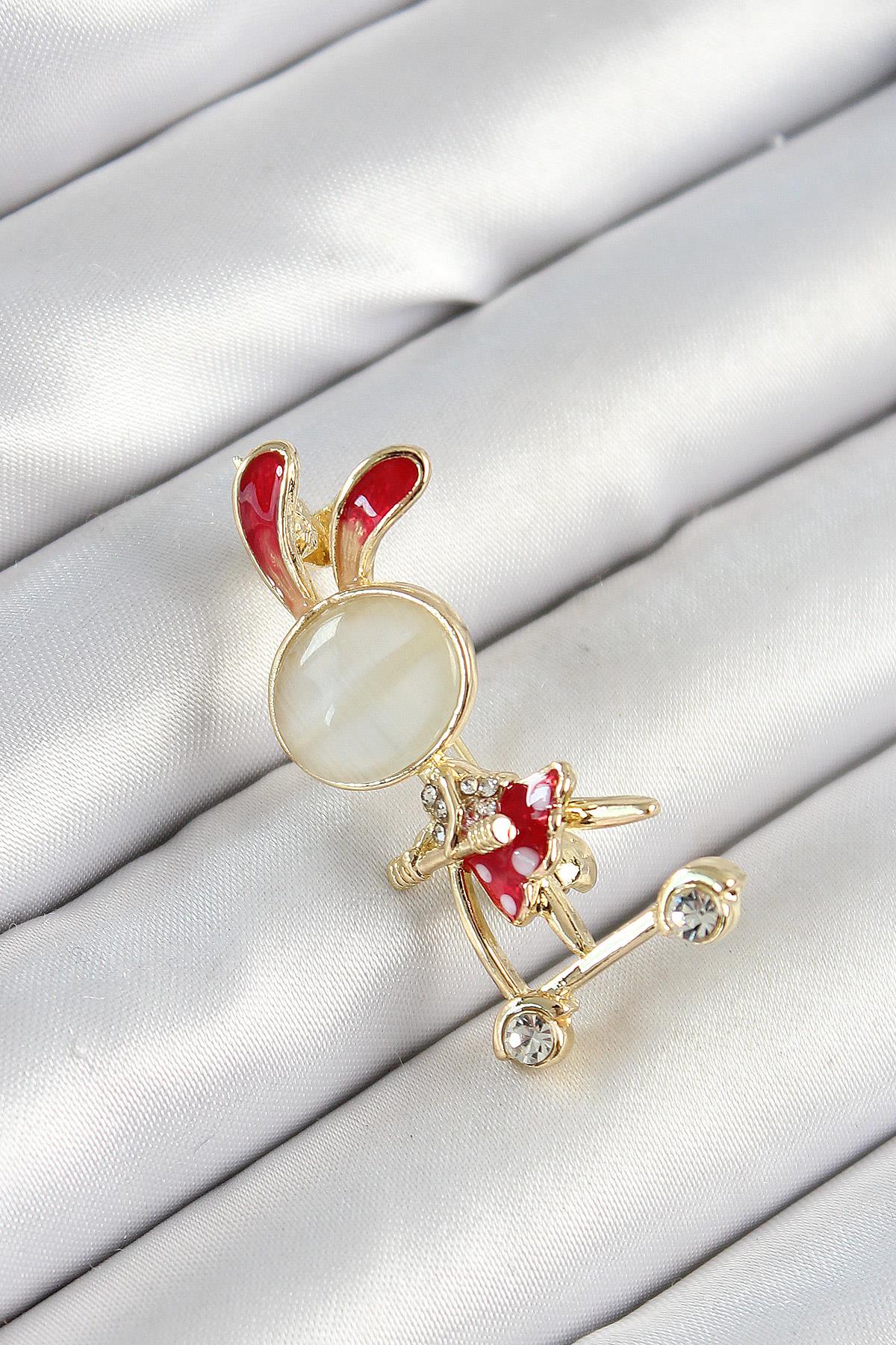 Zirkon Taş Detaylı Kırmızı 3D Scooter Süren Tavşan Kız Figürlü Gold Renk Kadın Broş - PRT3500EB06333