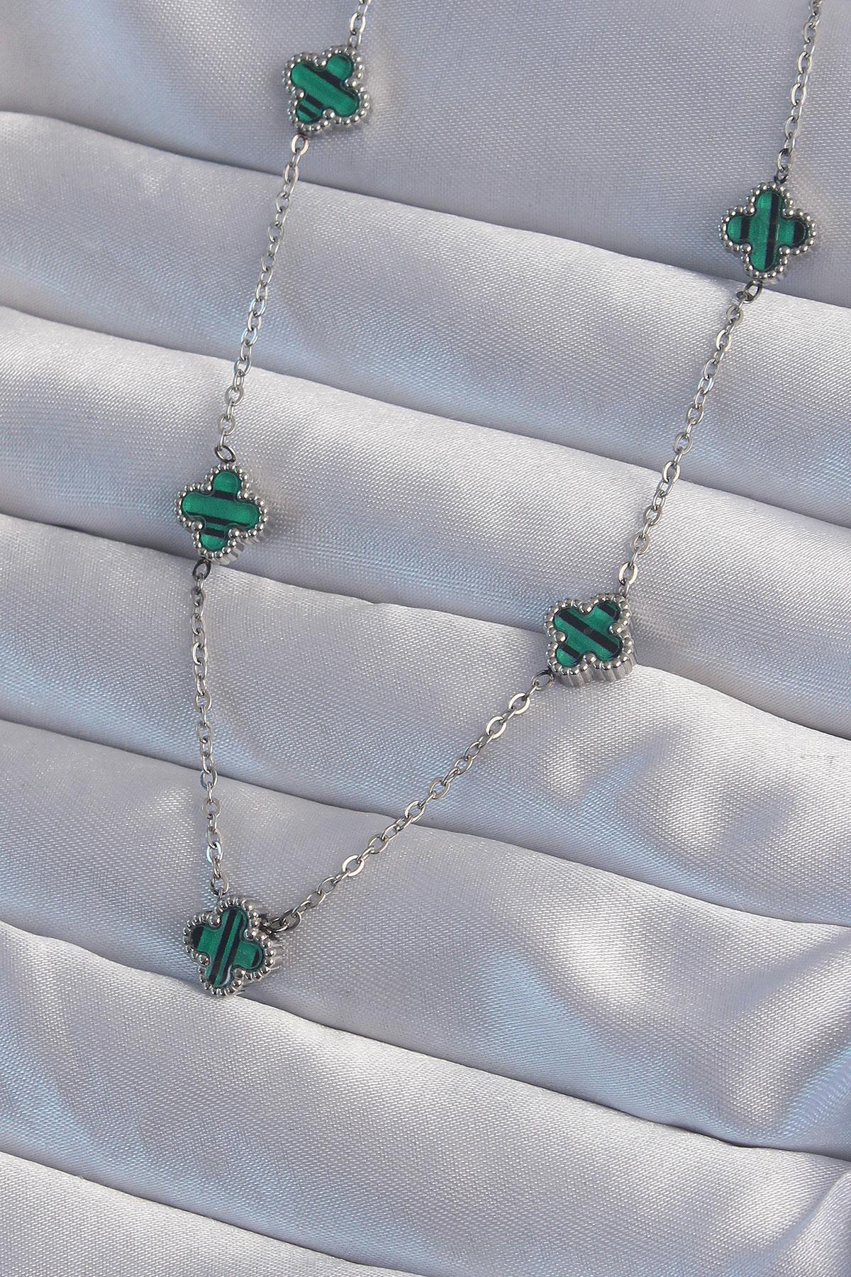 316L Çelik Gümüş Renk Minimal Yeşil Mineli Yonca Kolye - PRT3500EB08915