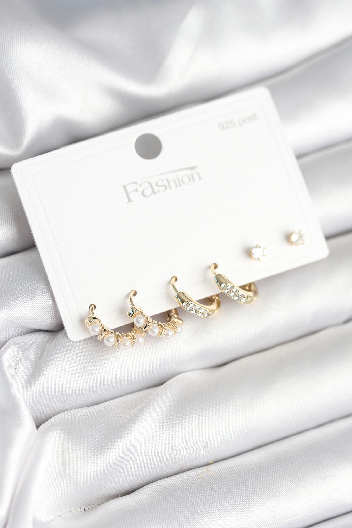 Pirinç Gold Renk Zirkon Taşlı ve İncili Model 925 Ayar Gümüş Çivi Kadın Küpe Seti