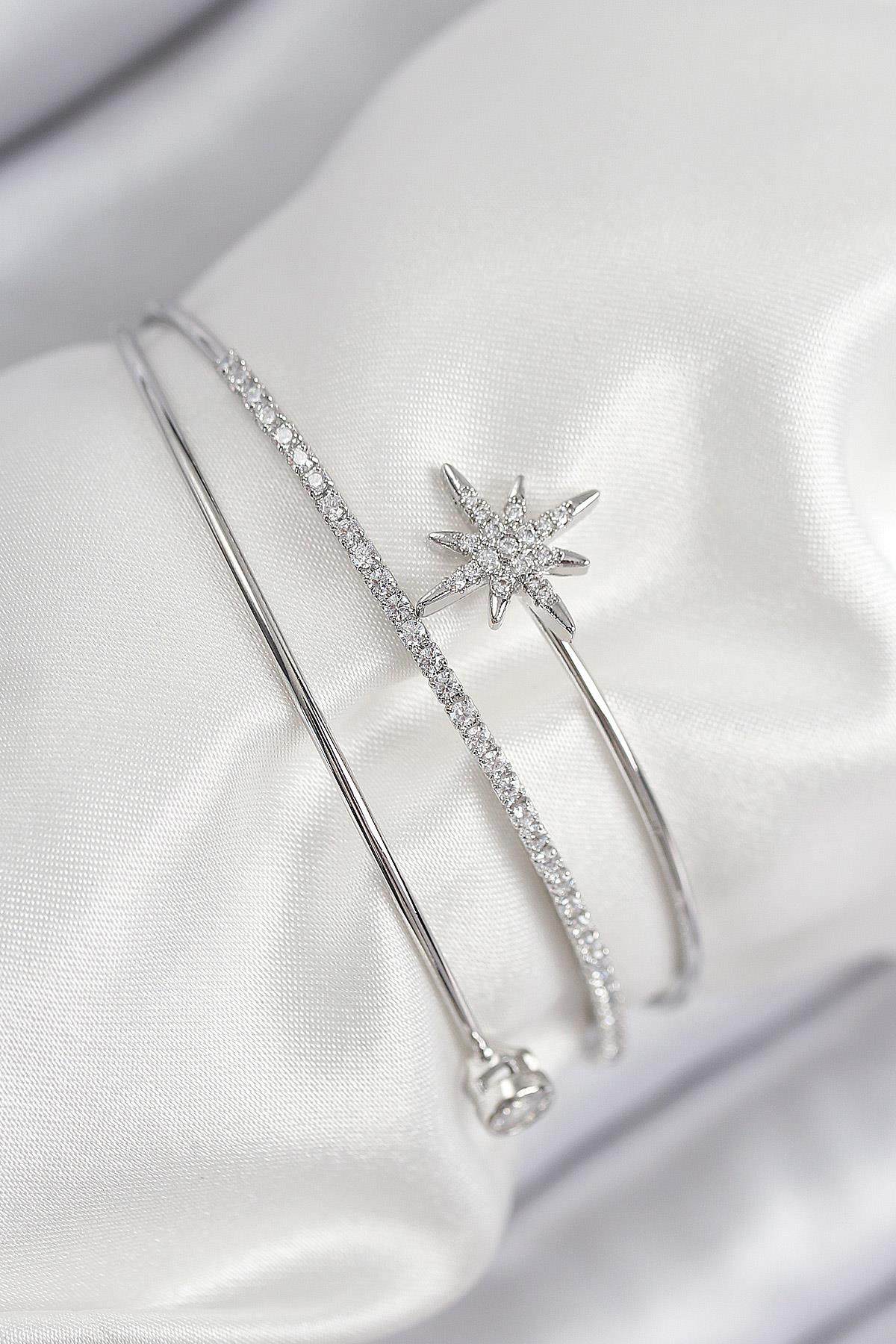 Pirinç Zirkon Taşlı Kutup Yıldızı Model Gümüş Renk Kadın Bileklik