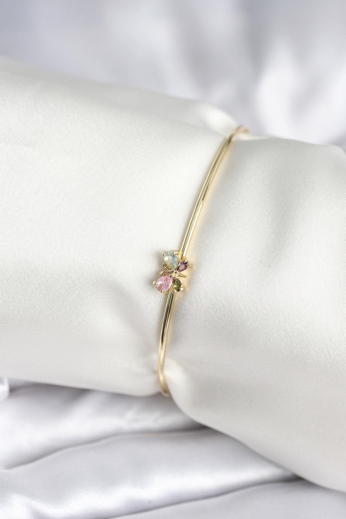 Renkli Kelebek Figür Gold Renk Pirinç Kadın Bileklik